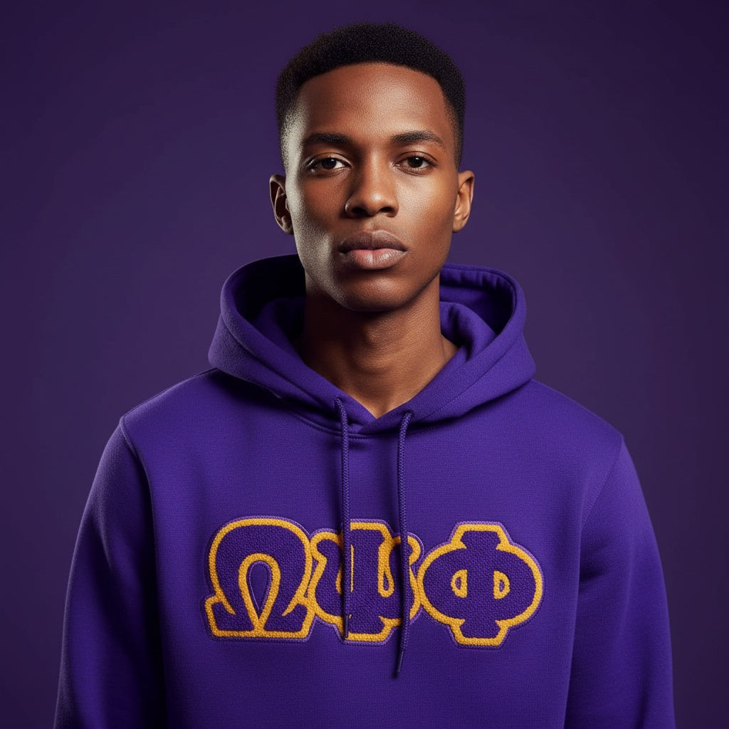 Rock your fraternity affiliation with this bold Omega Psi Phi Chenille Letter Hoodie—officially licensed gear that demands attention. Crafted from a durable 70% Cotton/30% Polyester blend, this medium-weight pullover delivers comfort without compromise. The striking chenille letter patch makes a statement wherever you go, letting your brotherhood loyalty shine through with unapologetic style. Perfect for those ready to wear their colors with confidence and swagger.